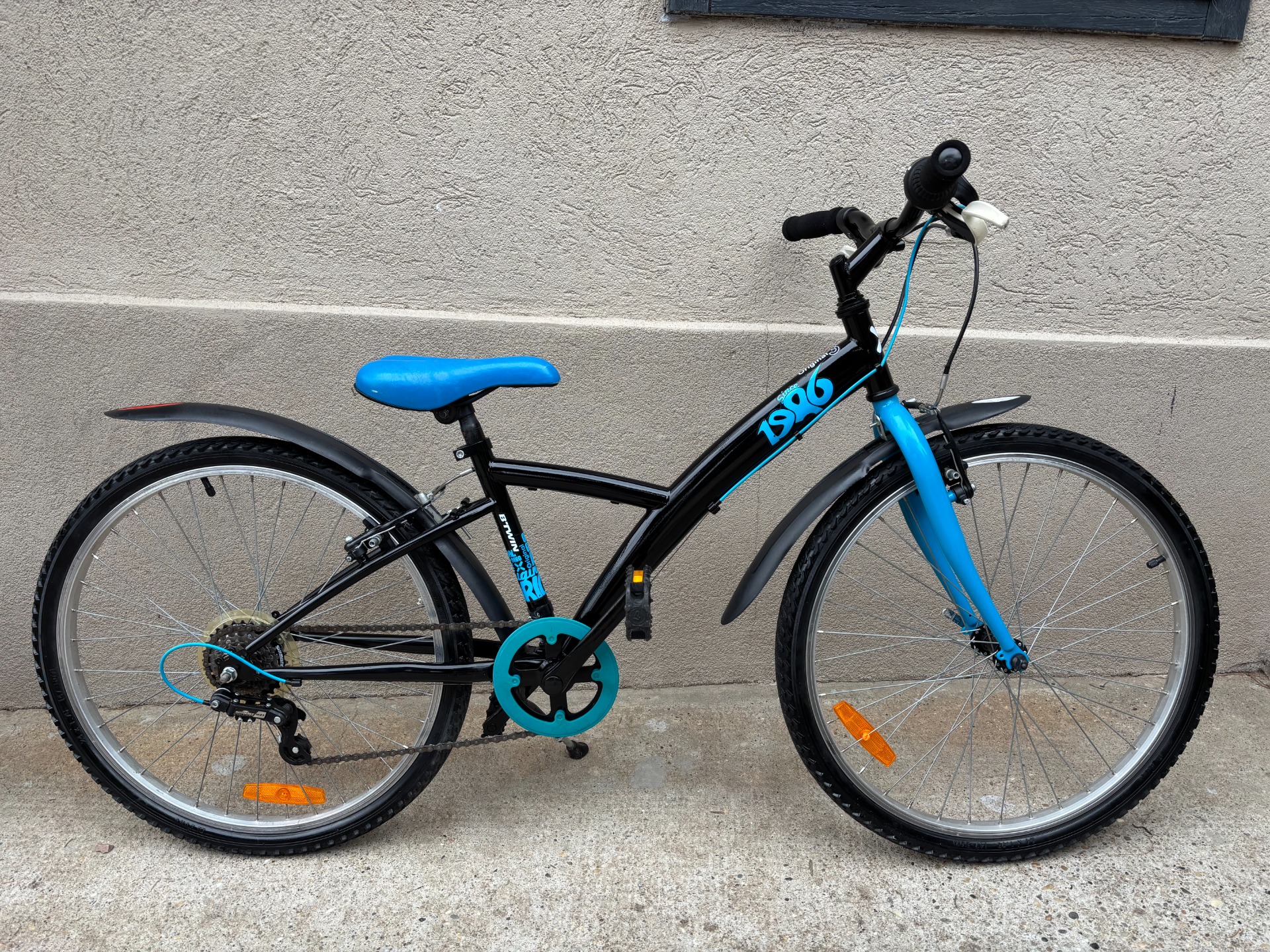 Szép állapotú, 24-es, acél vázas, B'Twin Original 3, Decathlonos gyermek kerékpár. 6 sebességes, Sunrace váltóval. 8-10 éves gyermeknek való. Kb. 128-150 cm testmagassághoz.