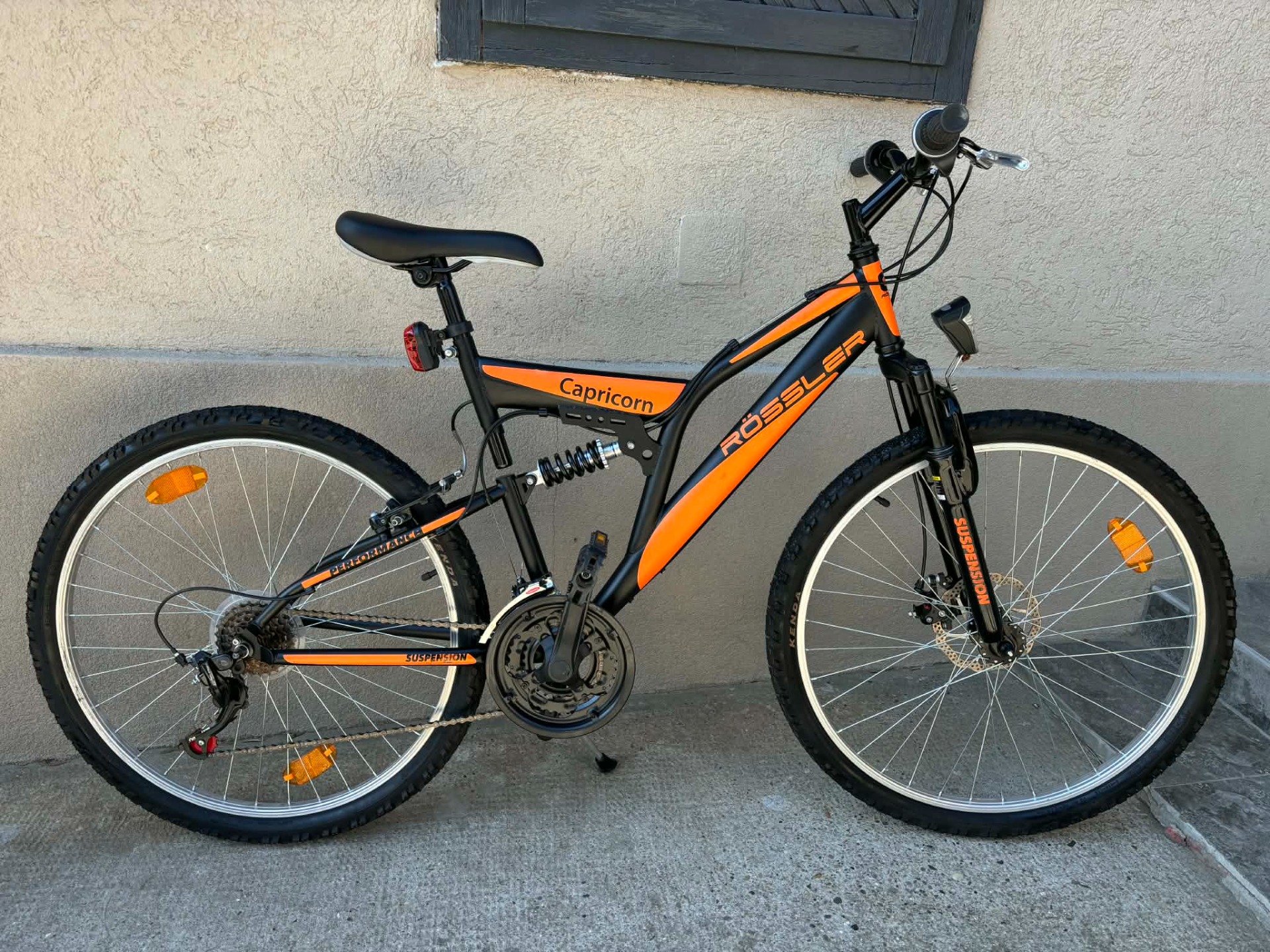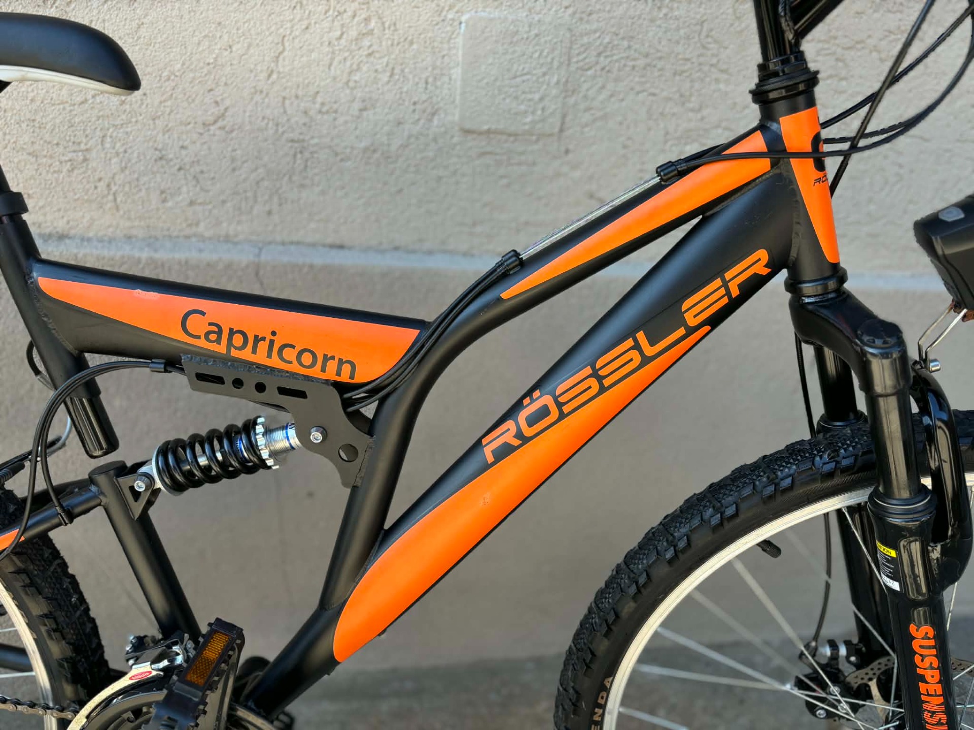 Nagyon szép állapotú, 26-os, acél vázas, összteleszkópos, Capricorn Rössler mtb kerékpár. 18 sebességes, marokváltós Shimano Tourney váltóval. Assess, első tárcsafékkel, Assess kerékagyakkal.