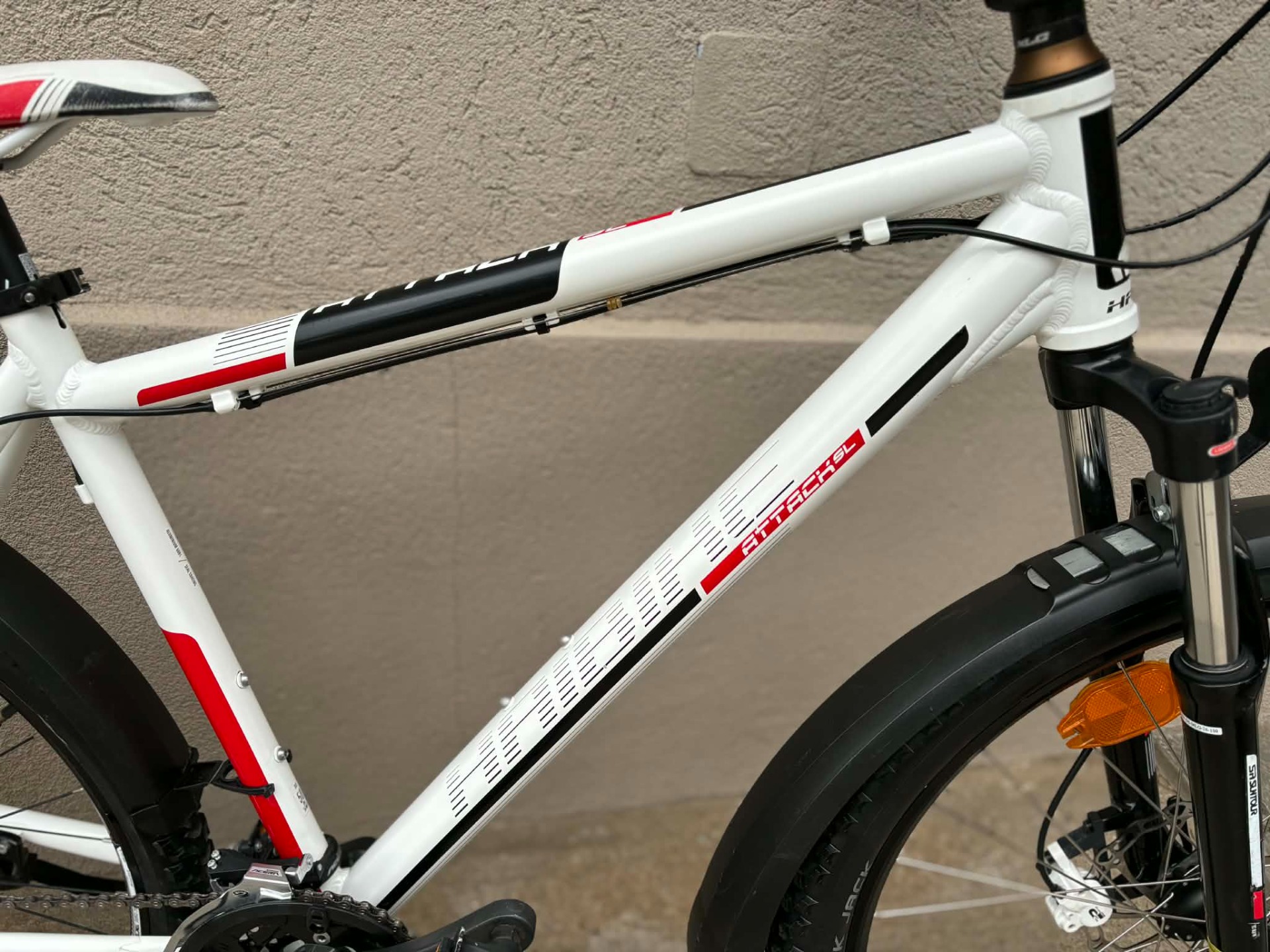 Nagyon szép állapotú, 26-os, aluvázas, Haibike Attack SL mtb kerékpár. 27 sebességes, Shimano Deore XT és Acera váltókkal. Tektro Draco, hidraulikus tárcsafékekkel. SR Suntour XCT, lockolható, teleszkópos villával. Duplafalú, szegecselt felnikkel. Shimano hajtókarokkal, Shimano, XLC kerékagyakkal, XLC stucnival, és kormánnyal, nyeregcsővel.