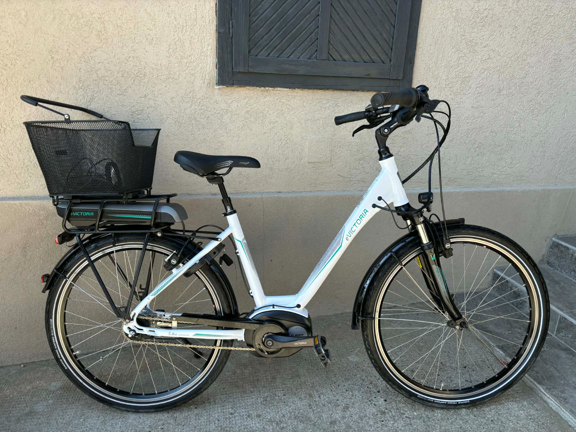 Gyönyörű szép állapotú, 26-os, aluvázas, Victoria 5.8 SE E-Bike kerékpár. 7 sebességes, Nexus agyváltóval. SR Suntour CR-8V teleszkópos villával. Magura hidraulikus fékekkel. Duplafalú, szegecselt felnikkel. Bosch Active Line motorral. 700 km-t futott.