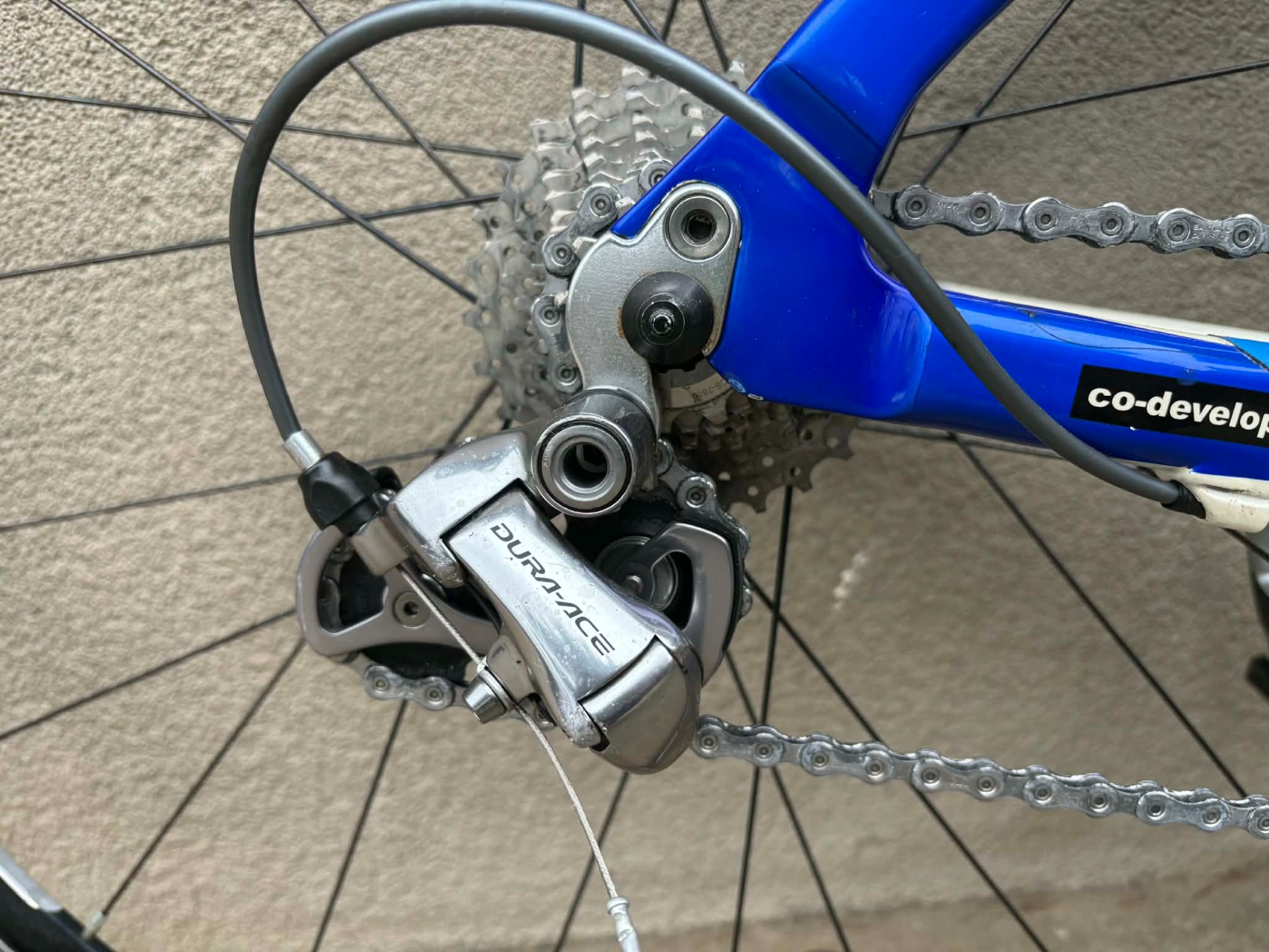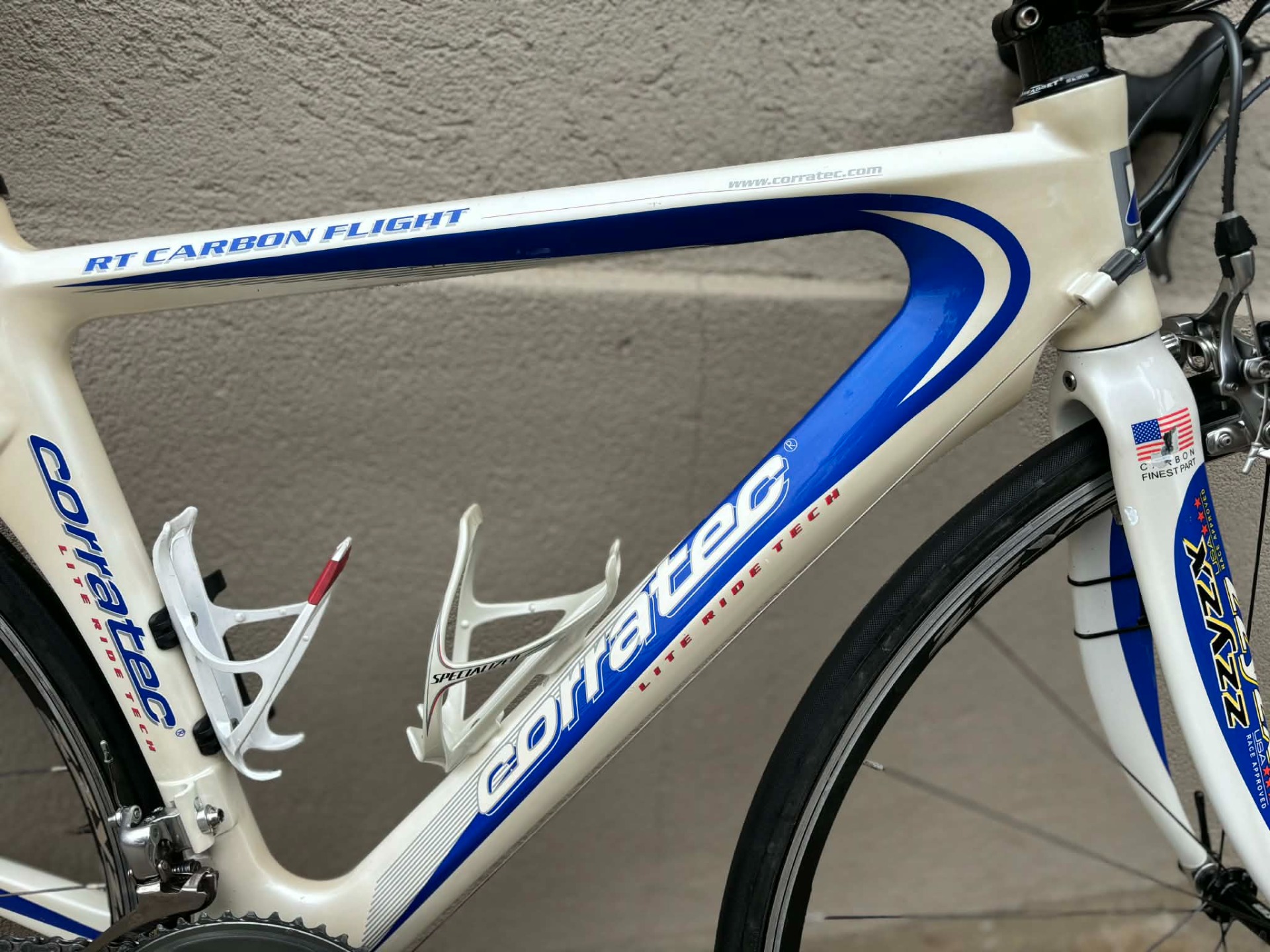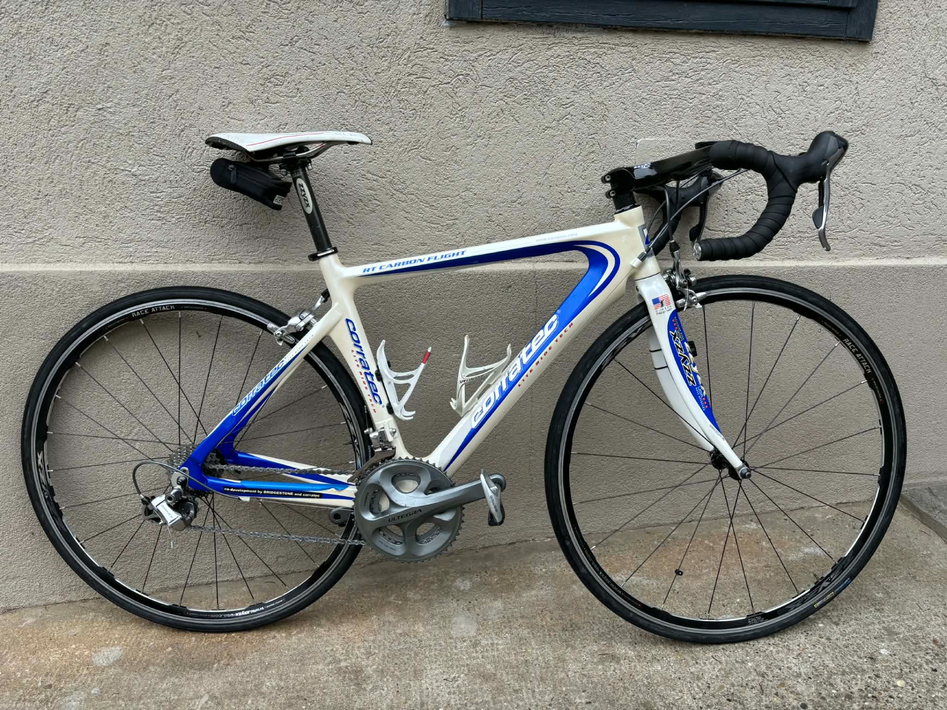 Szép állapotú, 28-as, karbon vázas, Corratec RT Carbon Flight országúti kerékpár. 2x10 sebességes, Shimano Dura Ace váltókkal. Shimano Dura Ace fékekkel. Shimano Ultegra hajtókarokkal. Zzyzx kerékagyakkal, Zzyzx kormánnyal, Zzyzx nyeregcsővel, Zzyzx duplafaú felnikkel. Specialized kulacstartókkal, Scicon nyeregtáskával, tartalék belsővel, Cateye sebességmérővel.
