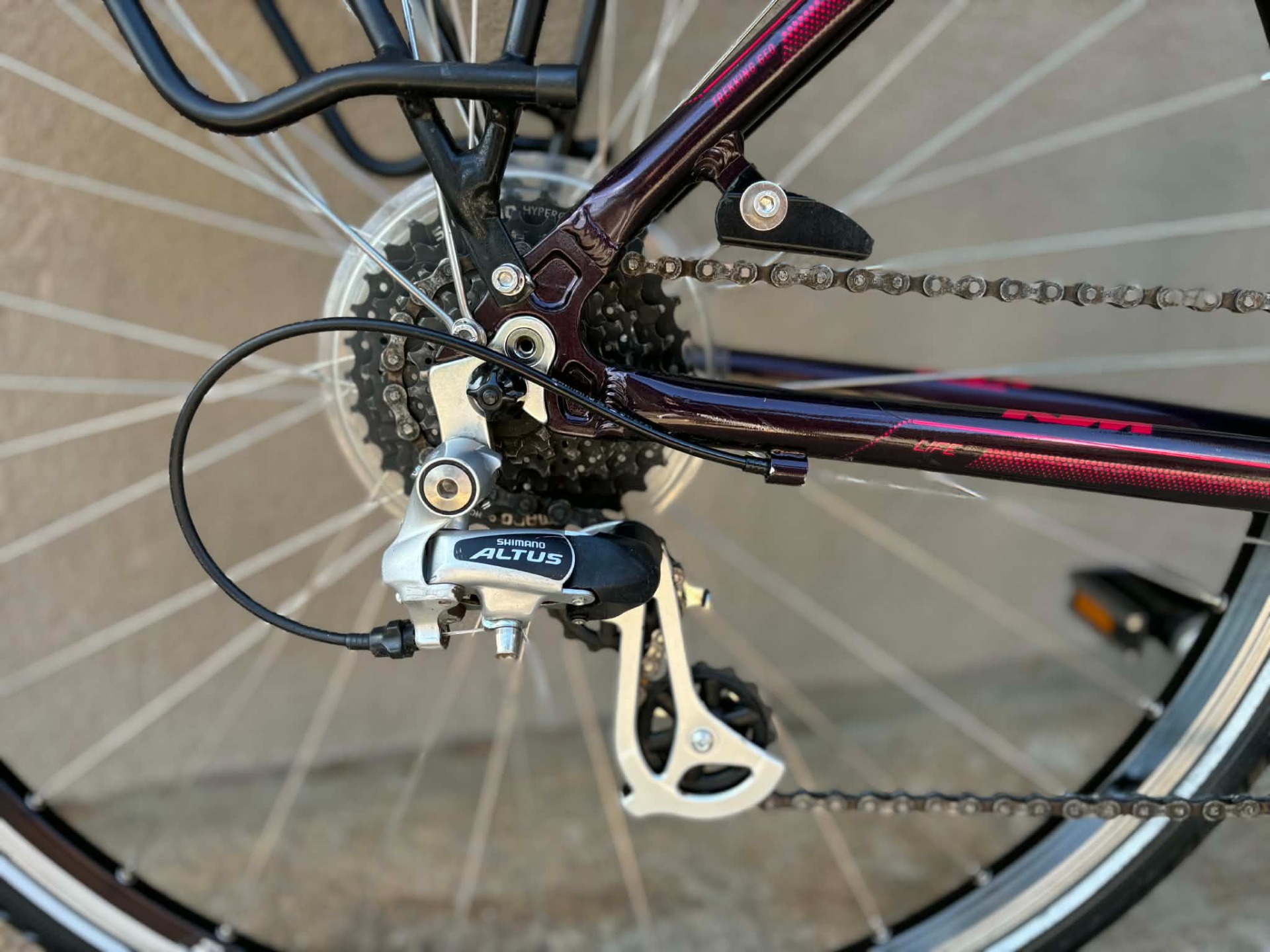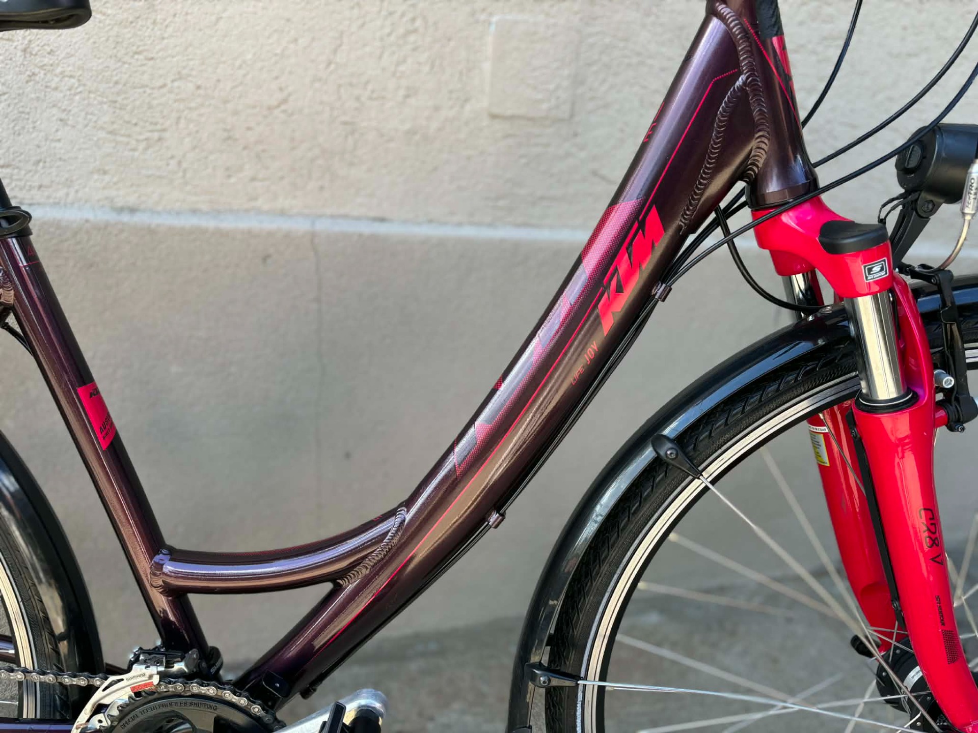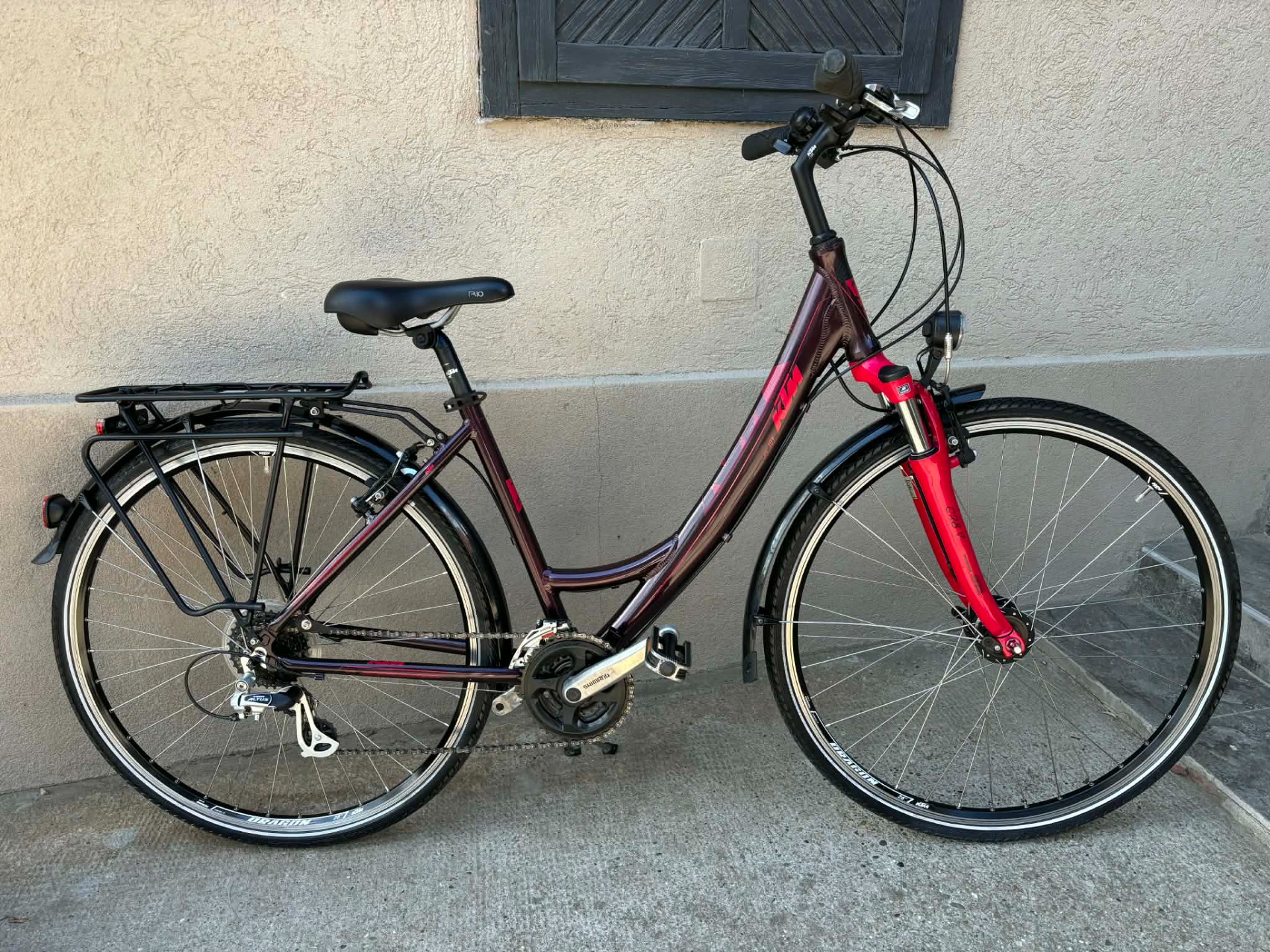 Nagyon szép állapotú, 28-as, aluvázas, KTM Life Joy trekking kerékpár. 24 sebességes, Shimano Altus váltóval, Shimano fékekkel. SR Suntour CR8V teleszkópos villával. Shimano hajtókarokkal. Dragon, szegecselt, duplafalú felnikkel. Shimano kerékagyakkal, agydinamós világítással.